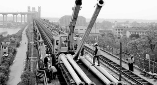 4月13日,中铁电气化局的施工人员在江西九江长江大桥铁路南引桥上行线吊装桥钢柱。 当日,京九铁路电气化工程九江长江大桥铁路桥改造开始全面立杆。 胡国林摄 (新华社发)