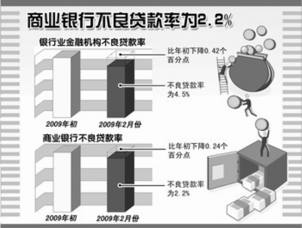 据银监会最新统计,截至今年2月末,我国银行业金融机构不良贷款余额和比例继续保持双降。不良贷款余额15334亿元,比年初减少175亿元;不良贷款率为4.5%,比年初下降0.42个百分点。其中:商业银行不良贷款余额5535亿元,比年初下降68亿元,不良贷款率为2.2%,比年初下降0.24个百分点。