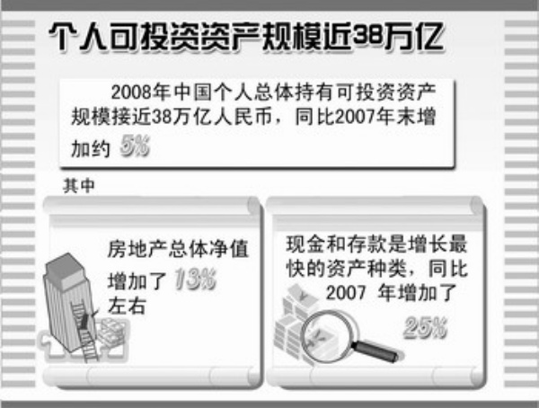 据招商银行研究报告,2008年中国个人总体持有可投资资产规模接近38万亿元人民币,同比2007年末增加约5%。其中,资本市场产品市值萎缩了50%左右;投资性房地产市场销量增速放缓,但总体净值仍增加了13%左右;现金和存款是增长最快的资产种类,同比2007年增加了25%。可投资资产是个人投资性财富(具备较好二级市场,有一定流动性的资产)总量的衡量指标。可投资资产包括个人的金融资产和投资性房产。其中金融资产包括存款、股票等资产。
