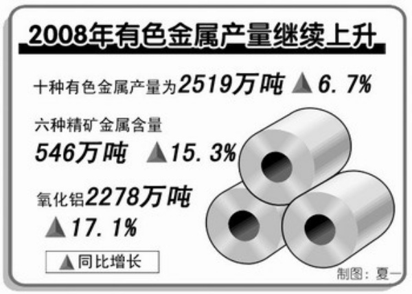 据中国有色金属工业协会初步统计,2008年,有色金属工业生产继续上升,十种有色金属产量为2519万吨,同比增长6.72%;主营业务收入预计为21000亿元,同比增长10%;实现利税1650亿元左右,实现利润为800亿元左右。2008年有色金属工业完成固定资产投资2331.9亿元,同比增长40.9%;新开工项目减少,有色冶炼投资热开始降温。
