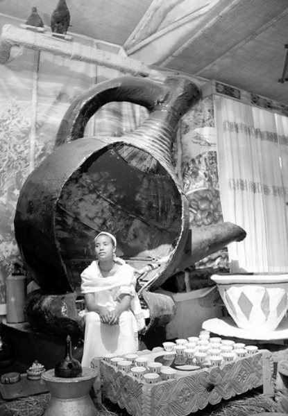 埃塞俄比亚是非洲最大咖啡生产国和出口国,也是世界第六大咖啡生产国,而其“咖啡女郎”的迷人风采,随着世界游客增多而逐渐名闻天下。图为在埃塞俄比亚的亚的斯亚贝巴,一位“咖啡女郎”在巨大的咖啡壶模型下等待为顾客服务。新华社发
