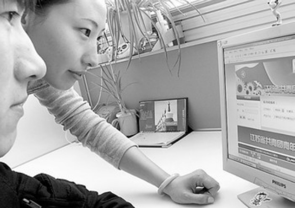 4月3日,江苏省共青团青年见习网正式开通,115家省级青年就业创业基地通过这个网站发布了近3800个岗位信息。图为两名实习大学生在浏览江苏省共青团青年见习网。 新华社记者 杨 磊摄