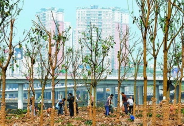 4月14日,工人在重庆朝天门长江大桥北桥头附近植树。从黄花园嘉陵江大桥北桥头至朝天门长江大桥北桥头的这片开放式绿地占地320亩,将设置休闲步道、座椅等设施。5月竣工之后,重庆市民可随时进入生态林休闲。 钟桂林摄(新华社发)