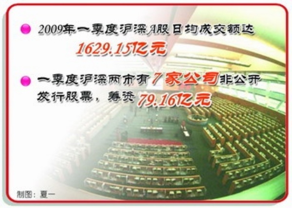 一季度,沪深两市有7家公司非公开发行股票,筹资79.16亿元。截至2009年3月31日,上市公司家数1625家,总市值161474.24亿元,流通市值68134.85亿元。