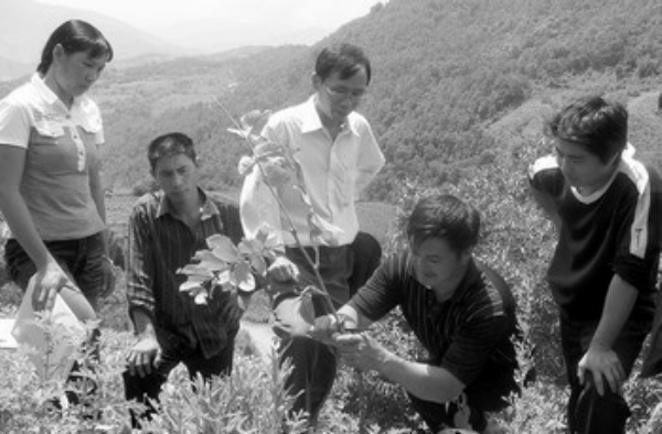 云南省永平县被国家林业局列为“全国核桃林业标准化示范区”。图为永平县林业局技术人员在山上给北斗乡群众传授泡核桃嫁接方法。 刘雄鹰摄
