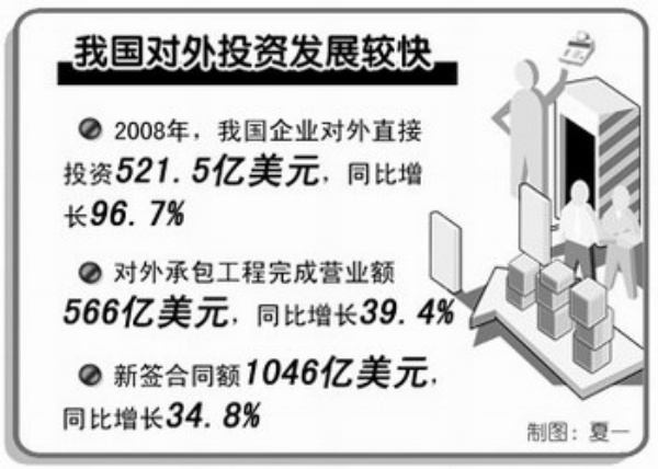 从商务部的统计数据看,国家鼓励企业“走出去”的政策和应对危机的系列措施已经有了初步效果。2008年,我国企业对外直接投资521.5亿美元,同比增长96.7%。
