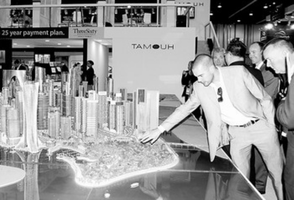 本届海湾房地产盛会规模继续扩大,展厅总面积超过4万平方米,集中展示了中东地区城市建筑开发领域的最新成就,参展项目涉及城市购物中心、居民住宅开发、商务楼宇以及公路桥梁等城市公共基础设施建设,吸引了来自30个国家和地区的300余家房地产商前来参展。据主办方统计,本届展厅面积与参展商户分别较上届提升30%与27%。“阿布扎比城市建设展”创立于2007年,至今已连续成功举办3届,被视为中东地区规模最大、效益最好的房地产业界B2B平台之一。图为首次亮相的阿布扎比未来城市风貌全景模型,吸引了许多参观者驻足观看。