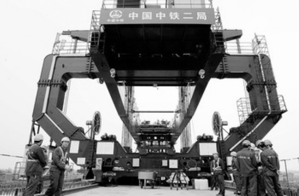 4月22日,在四川郫县安德镇,成都至都江堰铁路Ⅱ标段680多吨的首片箱梁正在架设。