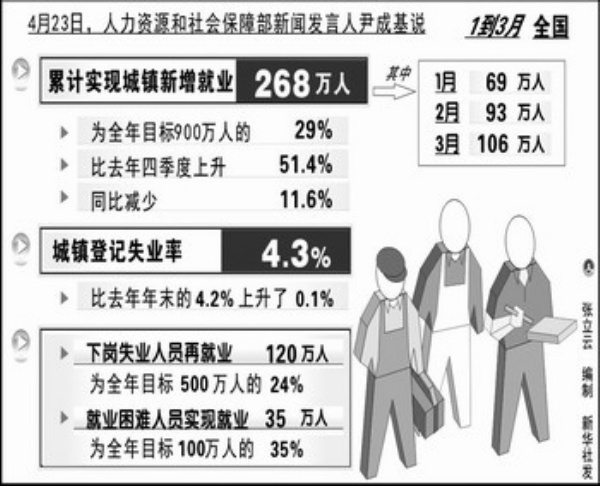 本报北京4月23日讯 记者任意报道:今年1至3月,全国累计实现城镇新增就业268万人,为全年目标900万人的29%;下岗失业人员再就业120万人,为全年目标500万人的24%;就业困难人员实现就业35万人,为全年目标100万人的35%;城镇登记失业率4.3%。这是人力资源和社会保障部新闻发言人尹成基在今天召开的新闻发布会上透露的。