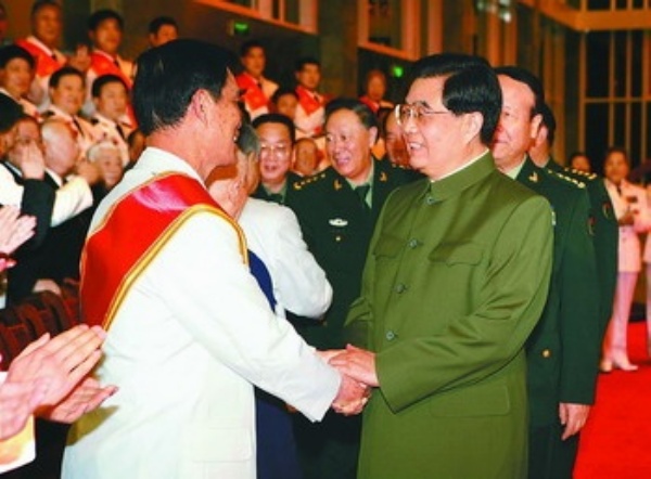 晚7时50分,胡锦涛等军委领导在中央军委委员、海军司令员吴胜利,海军政治委员刘晓江的陪同下,来到海军礼堂。在与海军老同志和英模代表亲切握手并合影后,胡锦涛说,人民海军已经走过了60年不平凡的历程。在党中央、中央军委的坚强领导下,在全国人民的大力支持下,经过一代又一代海军官兵的艰苦奋斗和不懈努力,海军建设和发展取得了辉煌成就,已初步发展成为一支多兵种合成的现代海上防御力量。人民海军为捍卫国家主权、安全、领土完整,为推进改革开放和社会主义现代化建设,为维护世界和平与发展,作出了重要贡献。