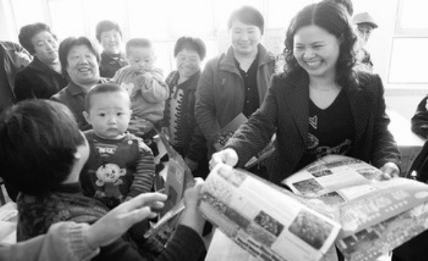 4月24日,河北省易县流井乡李家坟村群众工作站工作人员耿志红(右一)正在给群众发放科学种植核桃的资料。