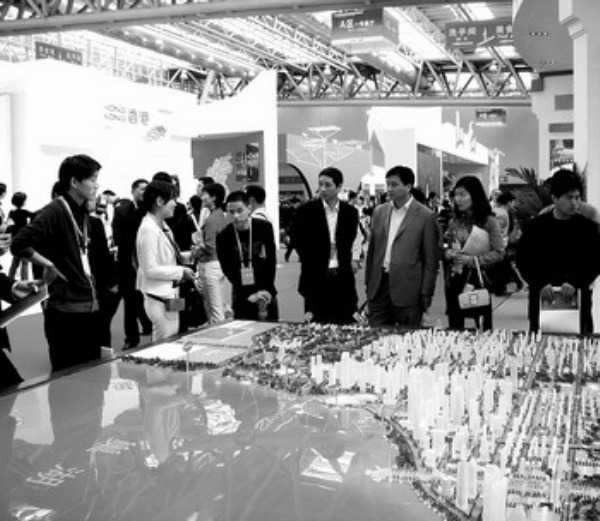 4月26日,第四届中国中部投资贸易博览会在安徽省合肥市拉开帷幕。图为参观者在观看合肥市滨湖城区沙盘展示。 本报记者 牛瑾摄