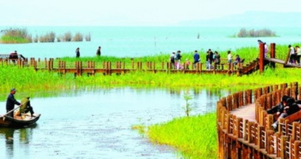 四月二十六日,游人在太湖边的水上栈桥漫步。入春以来,江南山温水软,苏州太湖风景区更是景致迷人,一湖春水万顷碧波,引来无数游人。新华社记者 陈琪摄