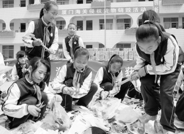 厦门海关积极推进以“尊重知识,崇尚创新,诚信守法”为核心的知识产权文化建设,推出“保护知识产权,要从孩子抓起”等系列宣传计划。日前,该关在厦门市海沧区东瑶小学举办了销毁侵权产品的活动,小学生们也积极参与,培养和提高了知识产权保护意识,树立起了尊重知识、崇尚创新、诚信守法的理念。此次活动中,共现场销毁仿冒知名品牌的手机、皮包、汽车配件、机电产品、香烟等各类侵权产品47万余件。本报记者 王玲 殷陆君摄影报道