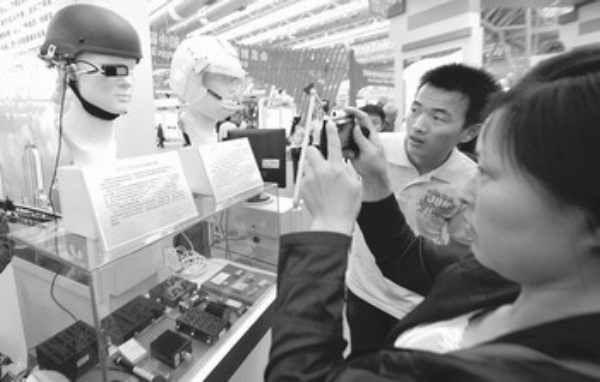 4月26日,观众在参观由安徽华东光电技术研究所研制的高新技术头盔显示器。