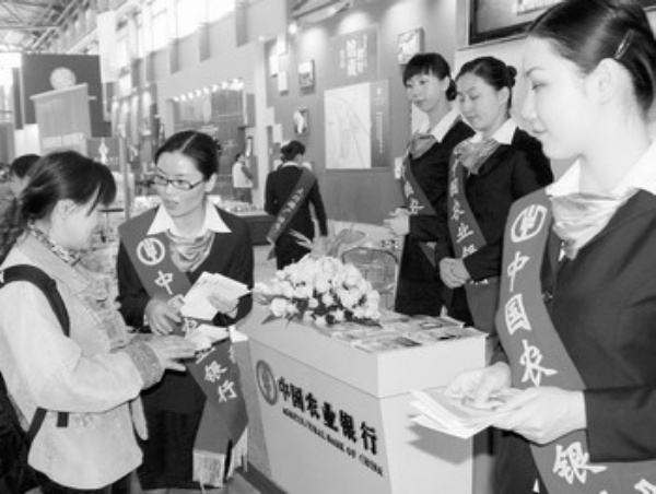 4月27日,农行云南分行职工在2009年昆明春季房交会上向参观者宣传房贷知识。从4月24日开始的2009年昆明春季房交会吸引了众多参观者,农行云南分行在展会上积极宣传房贷业务中的贷款知识和业务品种,收到良好效果。梁志强摄(新华社发)