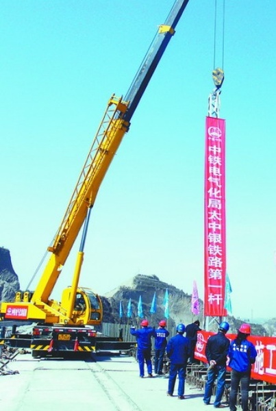 当日,太中银铁路(山西段)电气化工程正式动工。该工程正线全长747.75公里,银川联络线长94公里。整条电气化铁路计划2010年8月底全线建成。 文峰摄(新华社发)