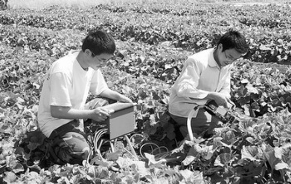 右图 北京农业大学的研究人员正在节水农业试验田里记录数字。