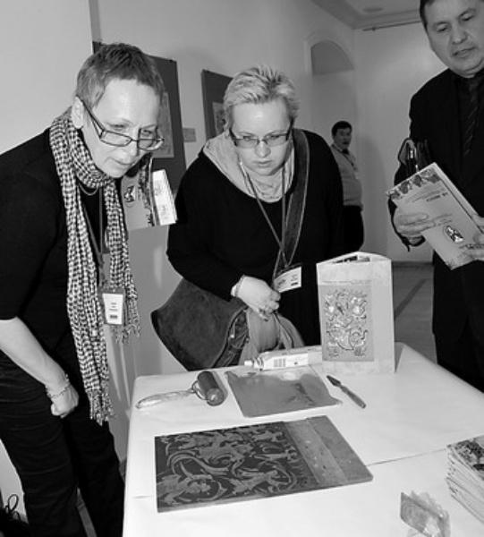 上海合作组织成员国实用工艺美术展在俄罗斯联邦鞑靼斯坦共和国首府喀山市开幕。图为在喀山市哈兹内国家艺术画廊,外国游客在中国展厅内观看木版年画。 新华社发