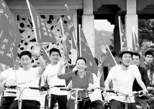 5月3日,由近百名泉州青年组成的3支自行车队从泉州市区出发,绕行中心城区主要街道,向市民宣传创建“绿色家园”,提高卫生意识和文明意识。 颜财斌摄(新华社发)