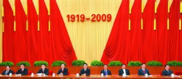 人民大会堂大礼堂鲜花竞艳,春意盎然。主席台台口上方是醒目的“纪念五四运动90周年大会”会标,后幕正中是“1919—2009”的红色大字,两侧分列10面鲜艳的红旗。二楼眺台悬挂着横幅:“紧密团结在以胡锦涛同志为总书记的党中央周围,高举中国特色社会主义伟大旗帜,团结动员广大青年继承和发扬五四运动光荣传统,为夺取全面建设小康社会新胜利、实现中华民族伟大复兴而奋斗!”大会开始前,与会各族各界青年代表高唱《光荣啊,中国共青团》、《歌唱祖国》、《没有共产党就没有新中国》等歌曲,会场内洋溢着澎湃的青春热情。