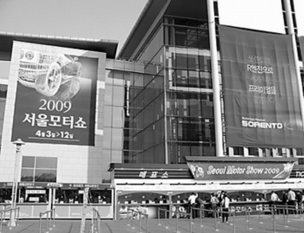 图为韩国国际展览中心外墙。2009年4月3日至12日,首尔国际汽车展在韩国国际展览中心(KINTEX)举行。据组委会预测,今年的车展吸引了100万参观者。 本报驻首尔记者 顾金俊摄