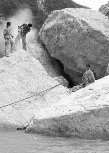 图1:排险官兵在“一把刀”堰塞湖岩石上打眼爆破。