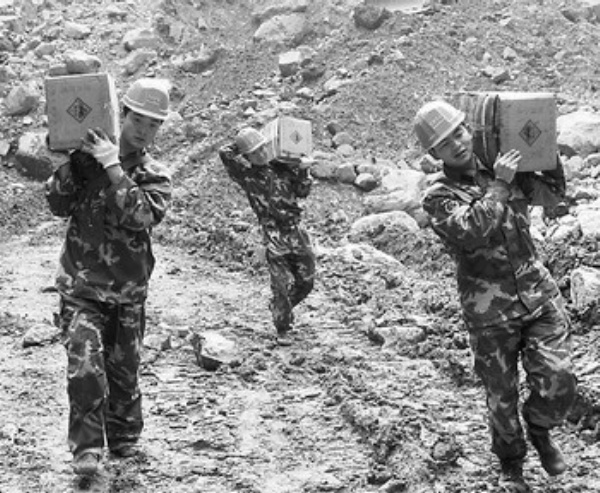图3:官兵往杨家沟堰塞湖坝顶上搬运炸药。