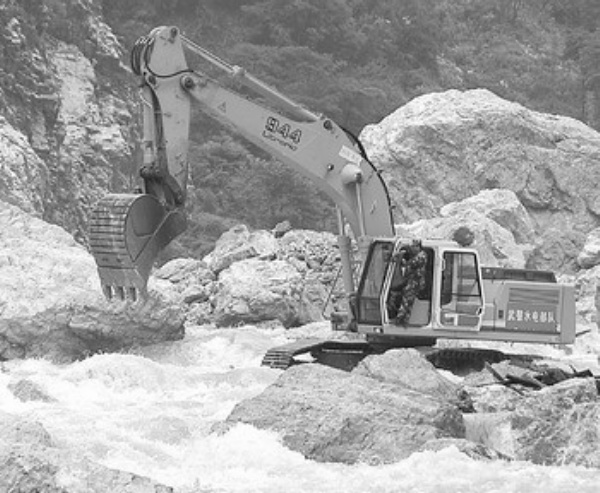 图4:官兵操作大型挖掘机在杨家沟堰塞湖挖掘导流渠。