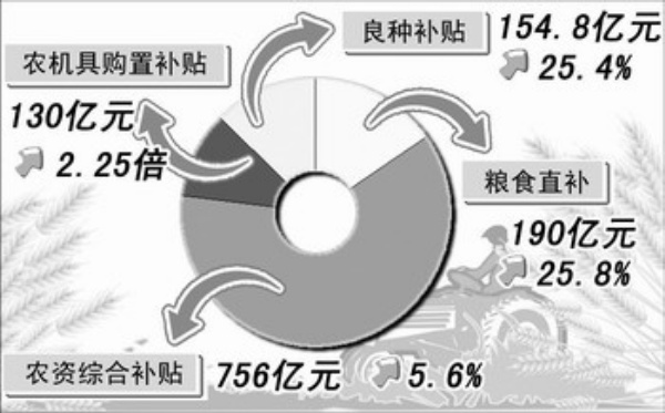 今年中央财政加大补贴农民力度,安排粮食直补、农资综合补贴、良种补贴、农机具购置补贴四项补贴1230.8亿元,增长19.4%。其中,粮食直补安排190亿元,增长25.8%;农资综合补贴安排756亿元,增长5.6%。大幅增加农机具购置补贴,安排130亿元,增长2.25倍,补贴种类由9大类扩大到12大类,覆盖到全国所有农牧业县;增加农作物良种补贴资金规模,在已实现水稻良种补贴全覆盖的基础上,进一步扩大小麦、玉米等良种补贴范围,安排154.8亿元,增长25.4%。支持较大幅度提高粮食最低收购价,增加农民收入。
