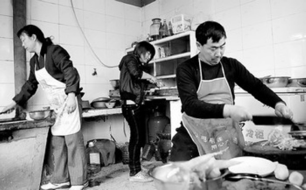 四川省绵竹市遵道镇棚花村4组村民鲜天全投入10多万元建起的“鲜李园农家乐”,吸引了众多游人,也为他带来了丰厚的收益。图为鲜天全(右一)和家人为游人准备午餐。      本报记者 李景录 通讯员 王 平摄影报道