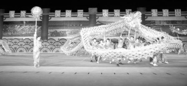17点58分,表演开始。地上的烟花喷射出来,龙身子里也嗖嗖地冒出金色的焰火,焰火中,两条龙交叉着游动起来。突然,从一个角落里抛出了一道红亮的光,瞬间在空中绽放开来,化成无数金色的小火花,铺天盖地。围观的人群惊叫起来,潮水一般向后退去。两条龙却直直地扑向火光,做出翻腾、跳跃的动作,仿佛真的活了。这边的铁水还没落下,那边又腾起一道红光,又是铺天盖地的金色。