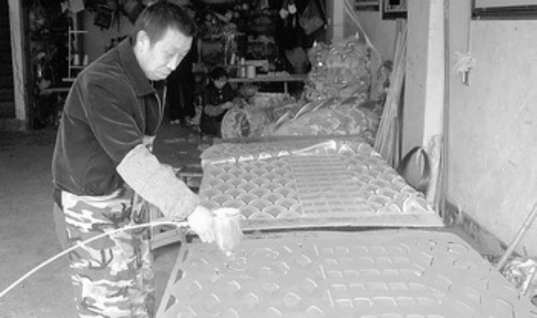 周合平的公司就在铜梁县城里,两层的小楼,一楼有3个工人正忙着扎龙头,缝龙身,粘龙珠。他们扎的龙已经跟传统工艺有了很大区别,最大的变化就是手工上色改为了直接在尼龙布上喷绘,他们自己刻了印版,用喷枪一喷,就能形成龙肚子、龙身上不同的鳞甲,再由人手工勾绘,缝上金片,“又快,又省钱,颜色还鲜亮。”龙头还是手工扎制、上色的,但是也做了改进,像舌头、龙角都用泡沫填充,“既饱满又轻巧。”