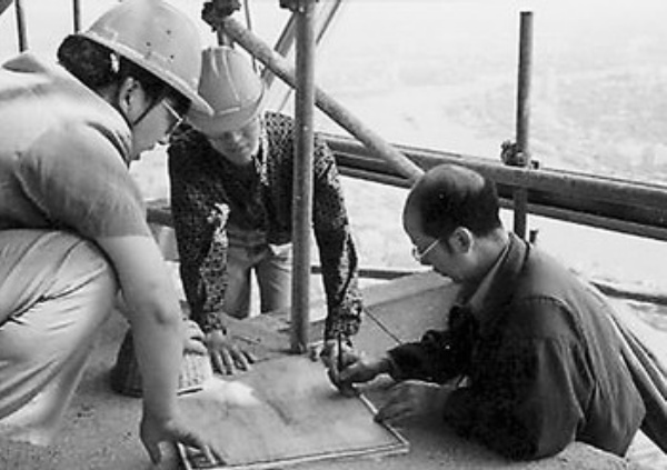 江欢成设计团队的解决方案得到了施工专家认可,质量之好为国内外同行叹服。百米桅杆先在地面组装,10天内提升到350米高空。50米的大球托在一个预应力碗上,45米大球吊在一把大伞下,施工十分方便。10万吨高塔,底板仅厚1.5米,多项技术创新使“东方明珠”终获成功。
