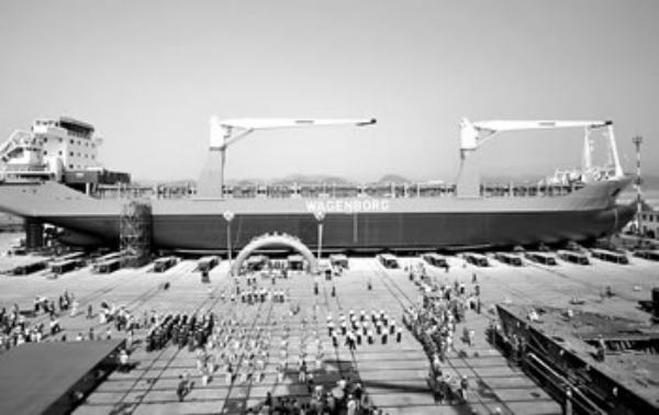 5月9日在宜昌船厂拍摄的1.2万吨级多用途远洋货轮“文珍特”号。当日,中国长航集团宜昌船厂出口荷兰的1.2万吨级远洋货轮“文珍特”号顺利下水。 黄 翔摄(新华社发)