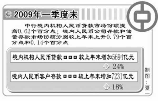 中国银行日前公布的一季度经营业绩显示,报告期内,该行抓住扩内需、促增长的良好机遇,积极扩大业务规模,加大有效信贷投放,存贷款业务快速增长。一季度末,中行境内机构人民币贷款较上年末增加5694亿元,增长24%,市场份额提高0.62个百分点;境内人民币客户存款较上年末增加7231亿元,增长18%;境内人民币公司存款和储蓄存款市场份额分别较上年末上升0.79个百分点和0.14个百分点。