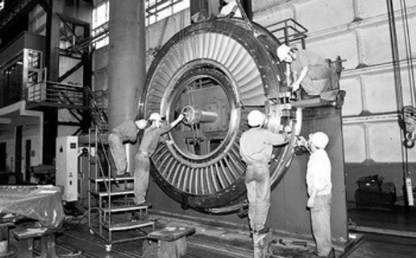上图:4月17日,东方汽轮机厂的工人们在燃气轮机的透平叶环旁工作。 新华社记者 何俊昌摄