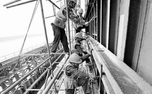 上图:4月9日,中铁一局桥梁公司的工人们在安装水中墩身模板。新华社记者 何俊昌摄
