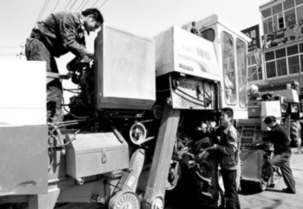 右图 5月6日,安徽省蚌埠市怀远县城关镇的村民在检修调试即将出征参加跨区麦收作业的联合收割机。