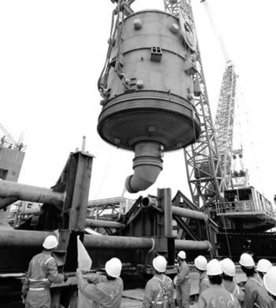 5月15日,中国石化第四建设公司工程技术人员在进行大型设备吊装作业。 截至目前,天津石化100万吨乙烯及配套项目已完成158台大型设备的吊装任务,完成总吊装量的96%,施工整体进入最后设备安装调试阶段,11月底将实现全面生产。 新华社记者 刘海峰摄
