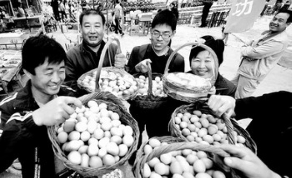 5月10日,河北易县狼牙山景区农民正在向游客促销柴鸡蛋。近年来,当地积极推行“红色旅游兴镇,绿色果品富民,种植养殖编织致富”的发展模式,“借东风”促农民增收。