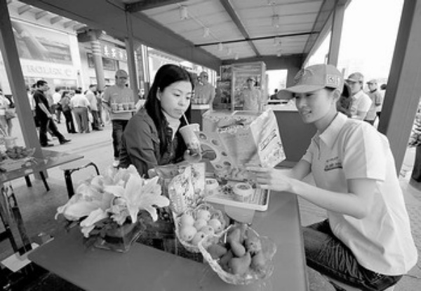 当日,京郊昌平区果农组建的鲜绿安果品专业合作社在北京王府井步行街开设的两家“果吧”开张营业,为满足消费需求、促进农民增收开辟了新途径。 新华社记者 张 旭摄