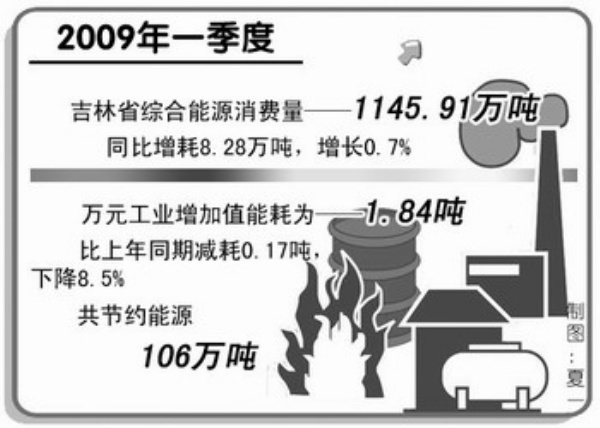 今年以来,吉林省工业企业着力克服国际金融危机带来的不利影响,能源经济效益继续得到改善和提高。据对全省规模以上工业企业统计,一季度,共完成增加值575.35亿元,按可比价格计算,比上年同期增长10.1%;综合能源消费量1145.91万吨(折标准煤,下同),比上年同期增耗8.28万吨,增长0.7%,万元工业增加值能耗为1.84吨,比上年同期减耗0.17吨,下降8.5%,共节约能源106万吨。
