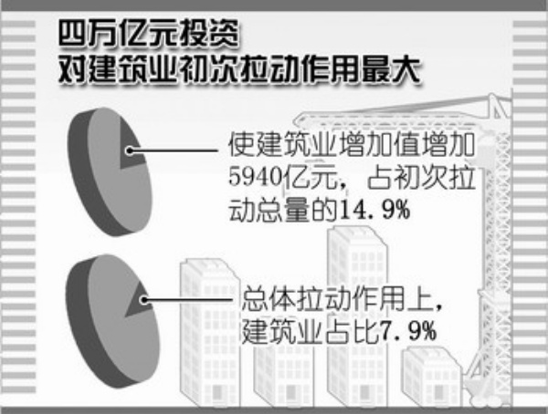 根据国家发展和改革委员会投资研究所测算,4万亿元投资对建筑业的初次拉动作用最大,使建筑业增加值增长5940亿元,占初次拉动总量的14.9%,总体拉动作用上,建筑业占比7.9%。另据国家统计局数据,1—4月,城镇固定资产投资37082亿元,同比增长30.5%。建筑行业在一系列保增长、扩内需的政策推动下,景气出现显著回升。