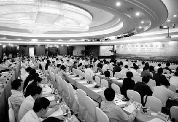 主题为“城市森林 品质生活”的第六届中国城市森林论坛在浙江省杭州市举办。图为专题演讲会场全景。