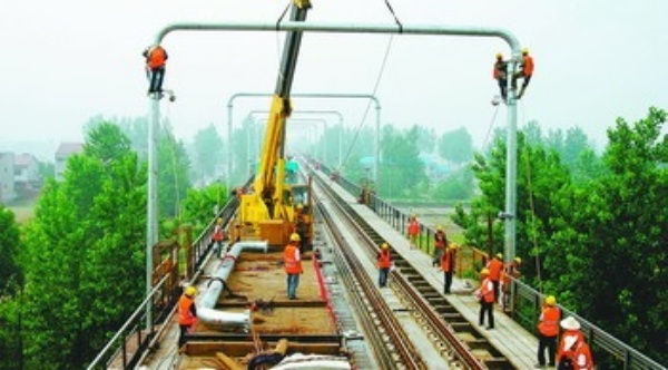 5月19日,中铁电气化局施工人员在九江长江大桥铁路桥北引桥上吊装横梁。