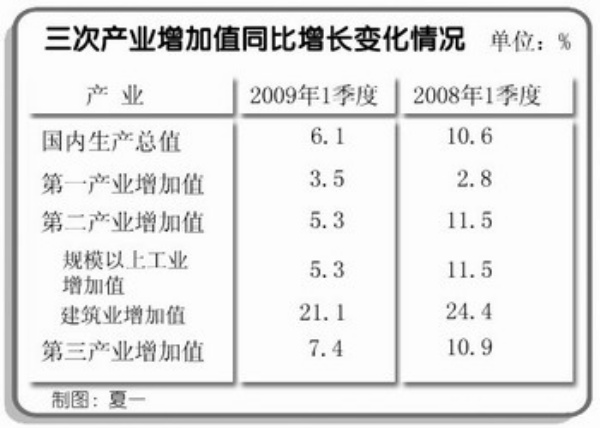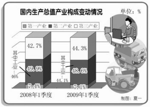 一季度,消费对GDP同比增速的贡献率高达70.5%,而2008年消费对GDP增长的贡献率为仅44.4%;投资包括固定资产投资和库存调整对GDP同比增速的贡献率为32.8%,比2008年回落13.9个百分点;净出口对GDP增长的拉动则由正转负,贡献率由2008年的8.9%变为今年一季度的—3.3%。需求结构的变化对GDP三次产业增长和工业生产增长造成了不同影响: