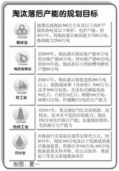 近年来,在有关部门、地方政府和企业的共同努力下,我国淘汰落后产能工作取得了较大进展。到2008年底,105万吨自焙铝电解产能已全部淘汰,落后炼油能力淘汰1000多万吨,鼓风炉炼铜产能淘汰15万吨,造纸落后产能淘汰547万吨,酒精落后产能淘汰94.5万吨,味精落后产能淘汰16.5万吨,柠檬酸落后产能淘汰7.2万吨。