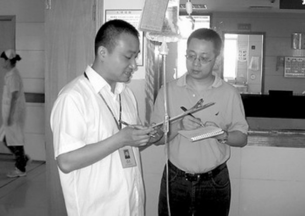 图3:本报记者王智(右)在夏克检查病房时随同采访。