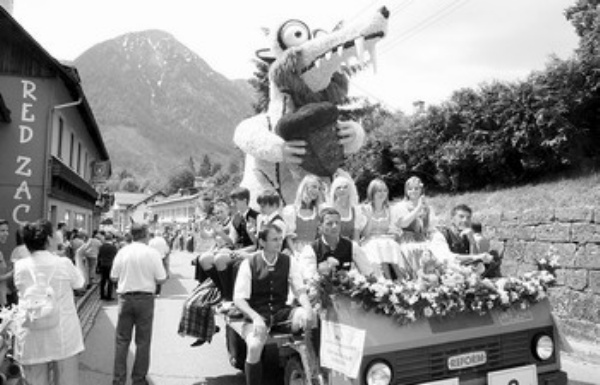 图为身着奥地利特色传统服装的当地居民选用数万朵水仙花制作了“松鼠”斯柯瑞特,打造了以著名好莱坞动画片《冰河世纪》为主题的花车。这辆花车巧妙融合了传统与现代因素,备受评委和游客的欢迎。 本报驻维也纳记者 王宝锟摄影报道